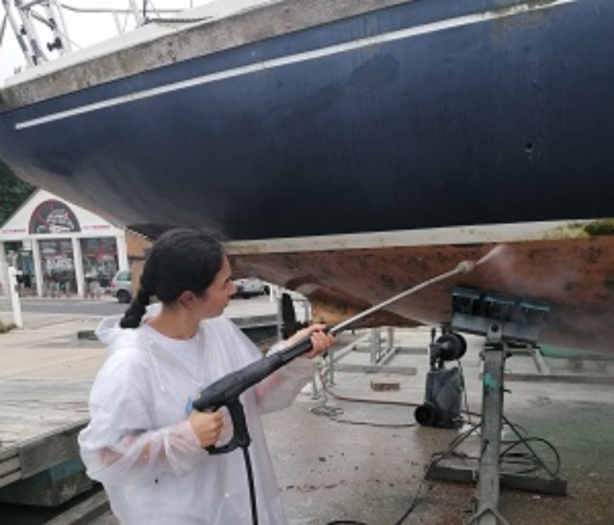 Et puis, le Lycée professionnelle Éric Tabarly, si connu et réputé aux Sables d'Olonne, a décidé de faire travailler ses élèves pour le rendre naviguant. Pendant plusieurs mois, ce sont donc des élèves de Terminale qui, ici, aux Sables d'Olonne, retapent les passe-coques (qui en avaient bien besoin); démontent, nettoient, remontent le moteur robuste; traitent le problème gravissime d'infiltration sur le pont; refont l'électricité...